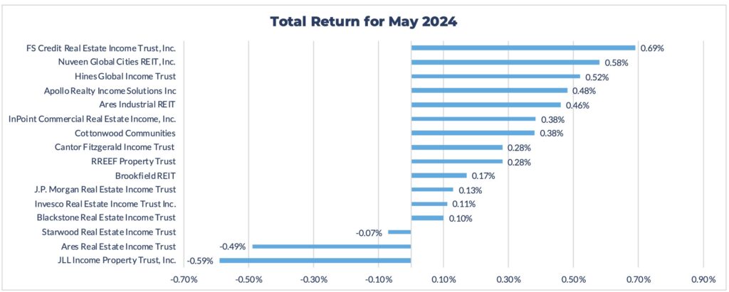 With a monthly pro-rated distribution rate, 13 of the 16 NAV REITs had positive Class I shareholder returns in May 2024. The median total return for May for the group was 0.28%, which is a decrease from the prior month’s median total return of 0.40%. As seen in Chart I, Nuveen Global Cities REIT, Inc. and Ares Industrial REIT had the largest increases in Class I NAVs per share. Chart III shows the positive total returns for 13 of 16 NAV REITs, with Nuveen Global Cities REIT, Inc. and FS Credit Real Estate Income Trust, Inc. leading the group.