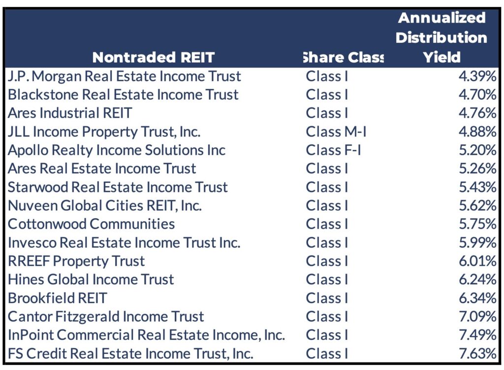All the NAV REITs were distributing cash to their Class I shareholders at rates far above the average dividend yield on the S&P 500 listed stock index (1.35% as of March 2024) or the NAREIT All Equity REIT Index for listed REITs (4.19%). All NAV REITs had a distribution yield for Class I shares that exceeded the average distribution yield for listed REITs. The median distribution yield for the 16 NTRs was 5.69% as of May 31, 2024.