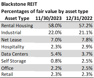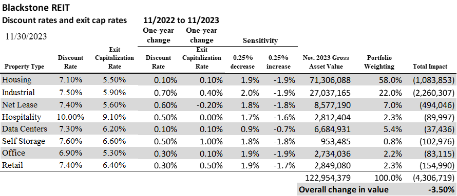 In the table below, we look at the discount rates and exit capitalization rates used by Blackstone REIT for the November 2023 valuation compared to the November 2022 valuation. When applied to the two valuations using the given sensitivities for each asset category, we can estimate the impact on the REIT’s property portfolio values over the 12-month period.