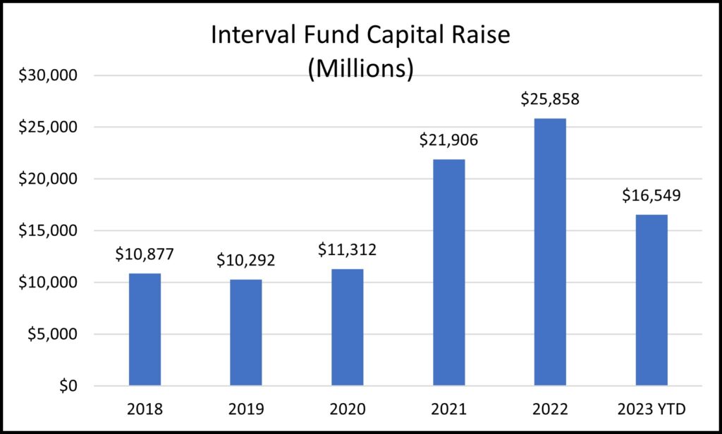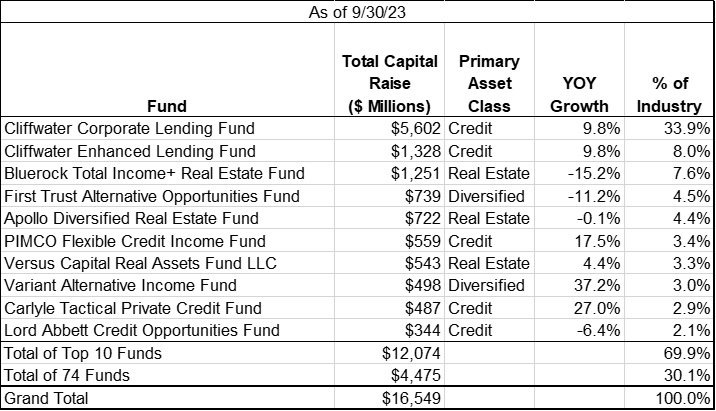The success of the interval fund sector contrasts markedly with the drop in capital raise by nontraded REITs. Nontraded REITs have raised just $10.6 billion with 17 nontraded REITs actively raising equity YTD through Q3. Interval funds raised $16.5 billion with the top 10 funds raising $12.1 billion over the same time period. Cliffwater Corporate Lending Fund raised over $5.6 billion YTD in 2023, 33.9% of the industry total. Cliffwater Enhanced Lending Fund raised $1.3 billion for an 8.0% share. As indicated, both funds are focused on credit investments.