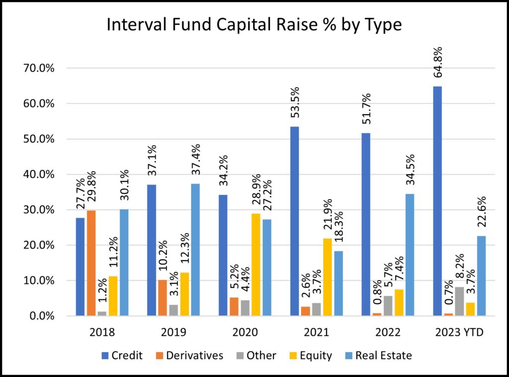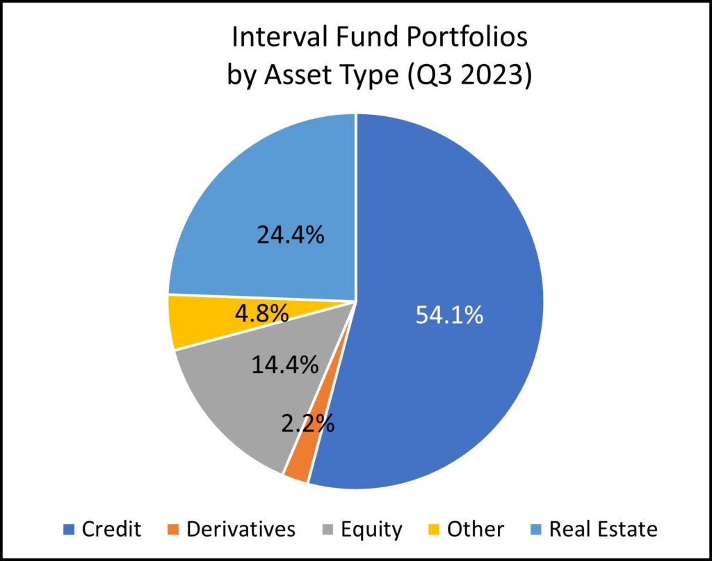 Interval funds focused on credit assets constituted 54.1% of the industry’s total assets, followed by real estate with 24.4% and equity at 14.4% of the industry’s total assets, as of September 30. 2023.